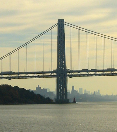 The George Washington Bridge is the most travelled bridge in the United States. At the bottom you can see the tiny Little Red Lighthouse.