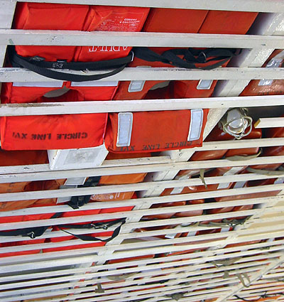 Throughout the cruise we moved around from outside to inside, lower deck to upper deck, to get the best views and to optimize hearing the tour guide. When we started out on the lower deck I noticed all of these life preservers. The first thing I thought of was the press interviews of the Staten Island Ferry accident victims and witnesses who said that when the boat crashed everyone grabbed for and started putting on the life preservers. I secretly hoped we wouldn’t be needing to use any of these on this trip.