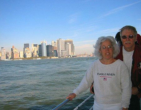 Mom & Dad in the front of the boat. Lower Manhattan is in the background.