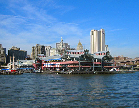 South Street Seaport is located in eastern Lower Manhattan. It is made up of about 100 shops, cafes and restaurants and a maritime museum. The Seaport is a popular tourist destination.